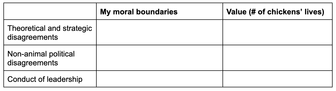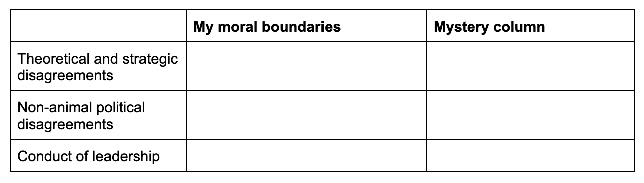 On a piece of paper (or just in your head), try listing out where your own boundaries are. What in each category would suffice for you to think someone should be barred from holding a leadership role in the animal movement, or even from participating at all? Structure it as a table, with space for a third column so we can come back to it later.